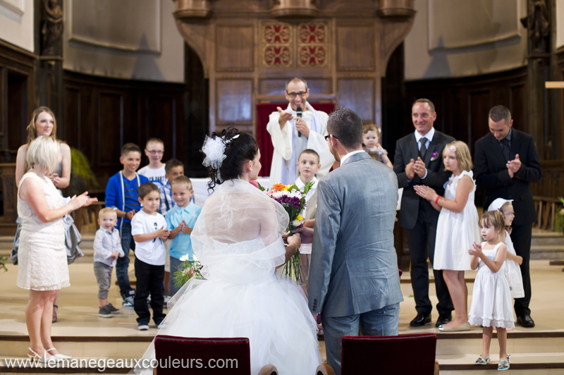 Le mariage d’Amélie et Nicolas a été le plus chaud de la saison : c’était le week-end de canicule du mois d’août… C’était un beau mariage et la joie était très présente chez les mariés et leurs invités. La demande en mariage avait eu lieu un an pile avant, le jour de leur 6ème anniversaire d’amoureux. Ils se sont donc mariés le jour de leurs sept ans, c’est donc tout naturellement que le thème du chiffre 7 s’est imposé. Il y avait donc des noms de tables contenant tous ce chiffre : les sept nains pour les enfants, le 7ème ciel (je sens que ça va faire arriver sur mon site de drôle de requêtes google) pour la table d’honneur, les sept poètes de la pléiade pour les collègues professeurs de la mariée etc etc… J’ai trouvé ça très original lorsqu’ils m’en ont parlé lors de leur rencontre, et cela a été bien mis en place. Je suppose que ça n’a pas été chose facile de trouver tous ces noms…