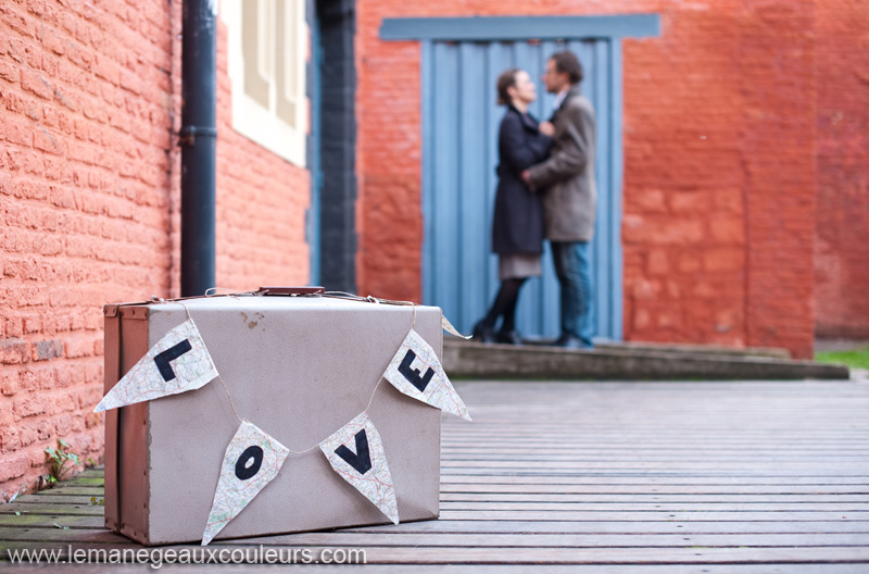 Marie et Philippe se sont mariés samedi. Leur mariage m’a fait une forte impression, tout comme leur séance engagement, qui s’est déroulée sur le thème du voyage… Je vous montrerai dans plusieurs semaines leur mariage, avec des notes de dentelle, des noeuds papillons, des boutons de manchettes noeuds roses, etc etc… Si vous suivez ma page facebook, alors vous avez sans doute vu les quelques aperçus que j’ai posté hier et ce matin… Pour leur séance engagement, ils avaient préparé quelques accessoires, et notamment une vieille valise et une banderole de fanions en carte routière, que Marie a réalisée… Marie et Philippe sont deux grands voyageurs, je ne pense pas me tromper en vous disant qu’ils ont fait le tour du monde ! Ils m’ont raconté leurs séjours en Nouvelle-Zélande, aux Etats-Unis et j’en passe… Ils m’ont fait rêver, je l’avoue ! Quoi de plus naturel, alors, pour deux baroudeurs, que le thème du voyage pour leur mariage. Nous avons voulu y faire un petit clin d’oeil lors de la séance engagement, en démarrant la séance dans les deux gares de Lille…