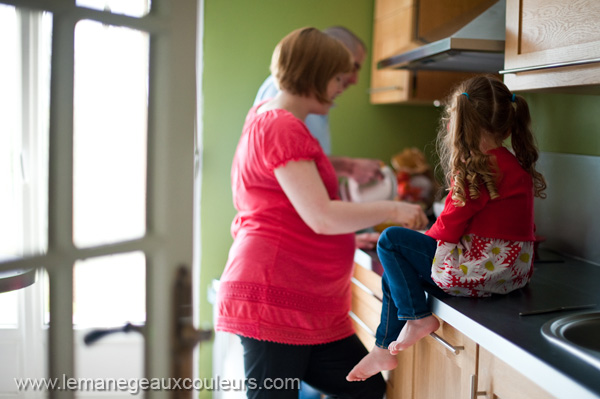 Voici une séance d’un nouveau genre pour moi… Une séance vraiment lifestyle à proprement parler, c’est à dire que j’ai tenté de capturer un instant de la vie de cette petite famille, qui n’est autre que la petite famille de ma soeur, que vous avez pu découvrir il y a quelques mois en studio… J’avais proposé à Céline de faire des photos pendant qu’ils feraient un gâteau (au chocolat) en famille… Vous remarquerez le joli bidon rond de ma soeur, qui attend bébé 2 pour le mois de juillet… 😀 Nous avons donc réalisé cette séance photo de grossesse en 2 parties : une partie famille en cuisine pour faire un (très bon) gâteau et une autre partie en studio à domicile, quelques photos en couple, beaucoup toute seule, et juste une ou deux en famille (je vous présenterai cette partie de la séance plus tard) puisqu’Alice n’a pas voulu poser ce jour-là 😉