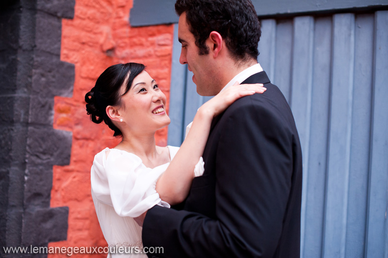 Shaoyu est chinoise et David est espagnol. Ces deux tourtereaux se sont rencontrés dans une école de commerce de Lille. Il se sont mariés civilement à La Madeleine et religieusement en Espagne. Shaoyu avait vu mon travail sur le mariage de l’une de ses collègues et elle avait adoré. Elle a été très déçue de ses photos de mariage en Espagne parce que trop classiques et conventionnelles. Alors elle a décidé de me contacter pour qu’on réalise ensemble une séance Jeunes Mariés à Lille et dans leur appartement. Nous avons commencé par quelques photos dans l’appartement : les accessoires (chaussures, robe, alliances…), et quelques images du couple jouant avec des macarons et des chocolats… Shaoyu portait sa robe chinoise, celle qu’elle avait mise pour la mairie. Nous nous sommes ensuite rendus dans le Vieux-Lille pour d’autres photos avec la jolie robe blanche que Shaoyu avait portée pour l’église, puis un tout petit tour au Marché de Noël (tout mini le tour parce qu’un samedi en décembre, c’est bondé de monde…).