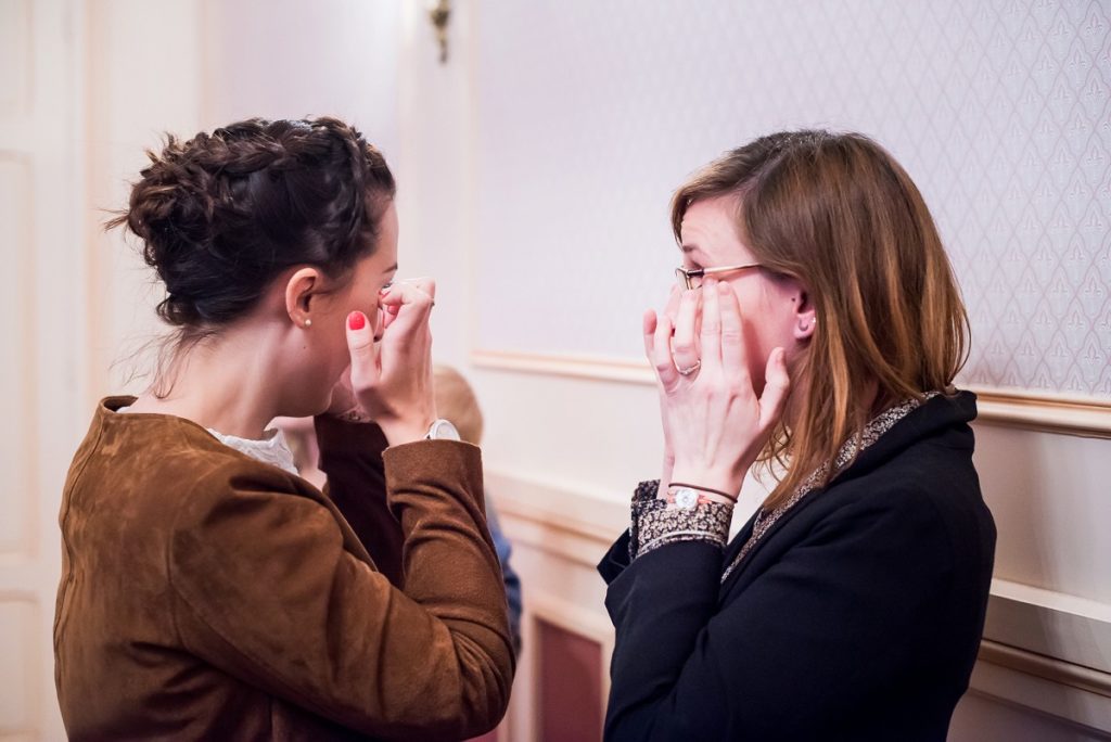 C’était fin novembre, il faisait plutôt froid. La surprise a été totale, personne ne s’attendait à ce mariage ! Je crois que les mariés avaient bien préparé leur coup ! En même temps, ils s’étaient décidés sur un coup de tête ! Quelques invités auraient aimé être dans la confidence pour pouvoir s’habiller en conséquence, pour un mariage et non pas un « simple » baptême… Mais de cette façon tout était très détendu, pas guindé, à leur image… L’ambiance de ce mariage surprise est tout à fait différente de celle qu’il régnait au moment de leur cérémonie laïque de mariage Hameau de la Becque puisque le froid s’était bien installé en cette fin novembre et la cérémonie se passait en soirée, alors qu’en octobre pour la cérémonie laïque il faisait encore très doux et le soleil était de la partie…