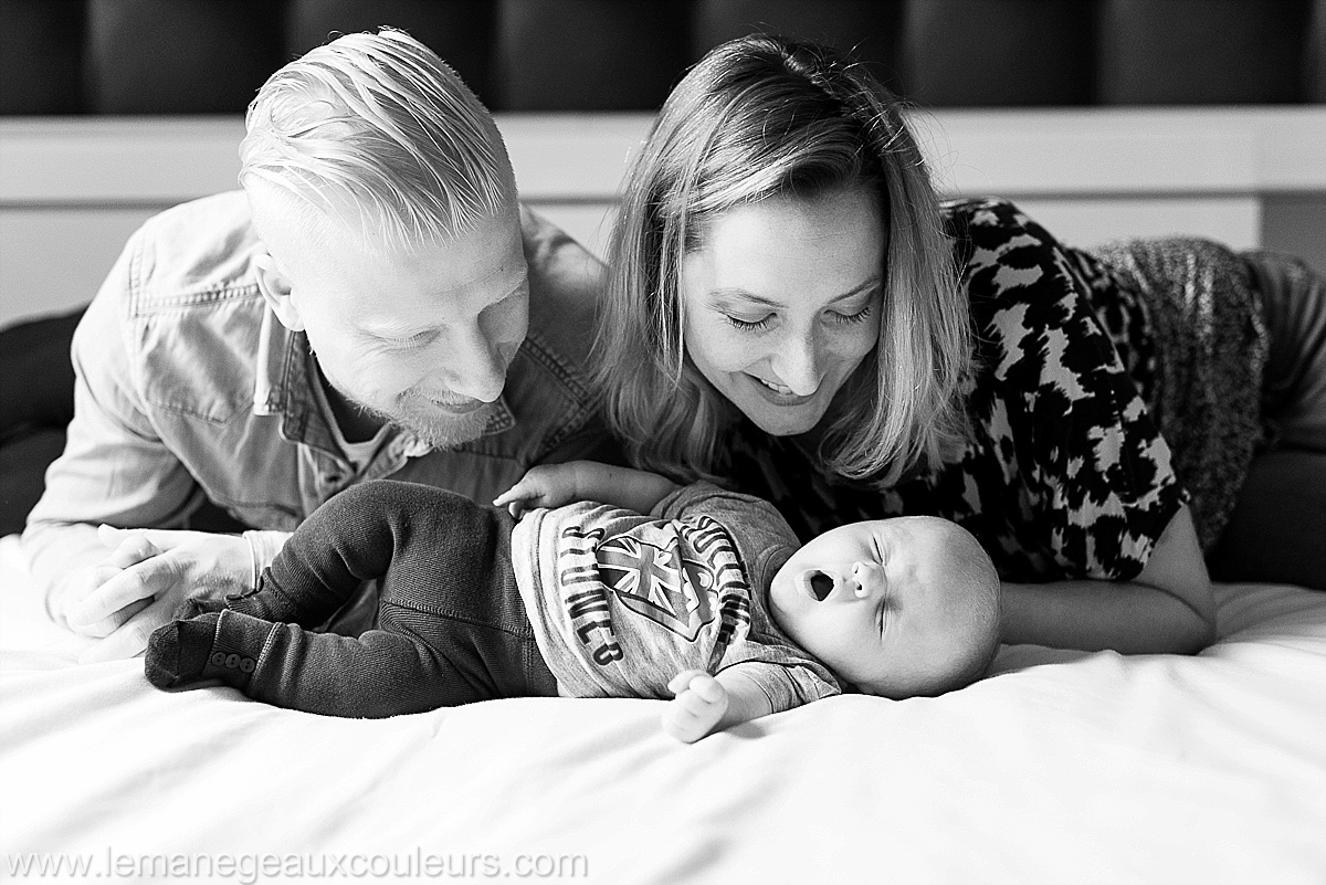 Vous souvenez-vous de la séance photo de ses parents alors qu’il était encore bien au chaud dans le ventre de sa maman ? Je vous présente aujourd’hui l’adorable Marcel, sa jolie petite bouille vous fera craquer j’en suis sûre. Pour cette séance photo bébé à la maison, les parents de Marcel ont souhaité attendre qu’il ait deux mois, pour qu’on puisse voir sa jolie frimousse de bébé et qu’il soit attentif aux gestes et aux paroles de ses parents. J’aime beaucoup réaliser les séances bébés à cet âge-là, à mi-chemin entre le nouveau-né et le bébé qui pourra bientôt s’asseoir. Quand je suis arrivée, Marcel dormait déjà, alors nous en avons profité pour photographier sa petite tête d’ange blond endormi. Ce que j’apprécie dans ces séances bébés à la maison, c’est aussi de pouvoir photographier le visage béat des parents, ils sont tellement adorables quand ils regardent leur bout de chou, vous ne trouvez pas ?