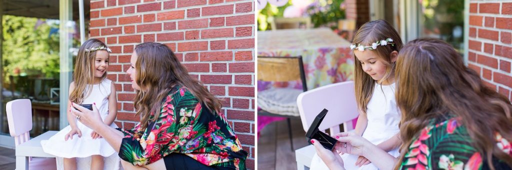 J’ai retrouvé par une belle matinée ensoleillée Marianne et ses parents. Ce sont ses parents qui l’ont habillée. Comme pour les reportages de mariage, je démarre généralement les reportages de baptême par l’habillage. Cela permet aux familles d’avoir des souvenirs différents de cette journée. Parce que le baptême ce n’est pas uniquement la cérémonie (qu’elle soit religieuse ou civile)… C’est aussi et surtout des moments passés tous ensemble ! Le parrain et la marraine de Marianne sont ensuite arrivés pour lui remettre ses cadeaux.