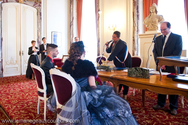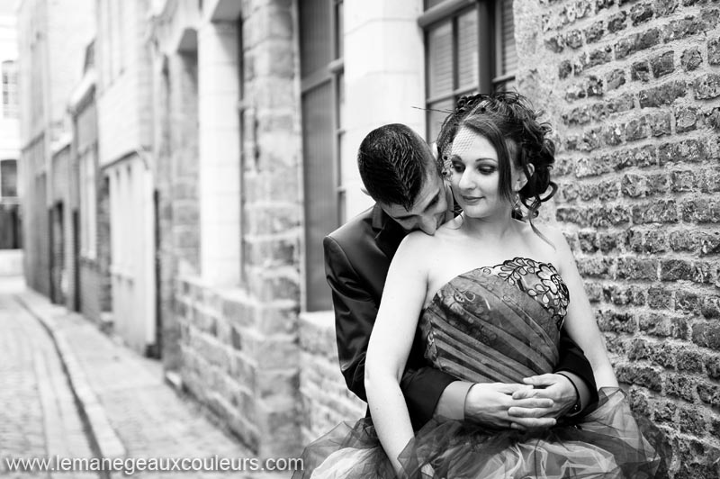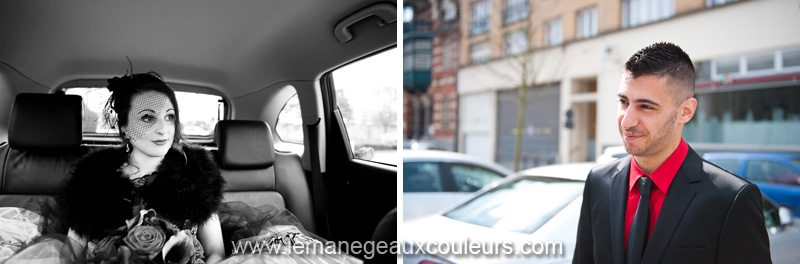 Vous aviez pu voir il y a quelque temps la séance engagement de Mélissa et Samuel dans la neige. Voici aujourd’hui leur reportage de mariage sur le thème du cabaret. Les jeunes mariés ont choisi le rouge et le noir comme couleurs de leur joli jour, et ont demandé à leurs invités de suivre ce code de couleur. La cérémonie civile a eu lieu à la mairie de Tourcoing. La mariée était en noir, une jolie robe faite de tulle noir et de tissu blanc, loin d’être classique en somme. Qu’on aime ou qu’on n’aime pas, la robe de la mariée correspond toujours à sa personnalité, et c’est cela qui est génial dans tous les reportages que je photographie. Un joli bouquet rouge et violet, et surtout de belles chaussures rouges. Pas très pratiques pour marcher dans le Vieux-Lille pour la séance couple, certes, mais ô combien superbes.
